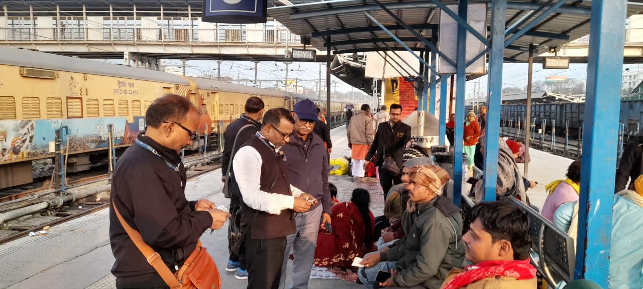 वरिष्ठ मंडल वाणिज्य प्रबंधक/प्रयागराज, श्री हरिमोहन के मार्गदर्शन में यात्रियों को उच्च स्तरीय सेवा प्रदान एवं बिना टिकट और अनियमित यात्रा पर प्रभावी अंकुश लगाने तथा यात्रियों को रेल नियमों के प्रति जागरूक करने के लिए प्रयागराज मंडल द्वारा प्रयागराज जंक्शन पर किलेबंदी कर टिकट चेकिंग अभियान चलाया गया । दिनांक 04.02.2026 को सहायक मंडल वाणिज्य प्रबंधक (कोचिंग)/प्रयागराज, श्री दिनेश कुमार एवं स्टेशन निदेशक/प्रयागराज जंक्शन, श्री वी.के द्विवेदी के सुपरविजन में प्रयागराज जंक्शन पर किलेबंदी कर सघन टिकट चेकिंग अभियान चलाया गया गया । इस अभियान के दौरान कुल 300 यात्रियों को प्रभारित कर ₹1,97,250 /- रुपये का जुर्माना वसूला गया । इनमें बिना टिकट यात्रा करने वाले 93 यात्रियों से ₹ 92,800 /-, अनियमित यात्रा करने वाले 207 यात्रियों से ₹1,04,450 /- रूपये जुर्माना वसूला गया । इसी क्रम में दिनांक 05.02.2026 को प्रयागराज जंक्शन – सूबेदारगंज स्टेशन के मध्य किलेबंदी कर जांच के दौरान कुल 1,600 किलोग्राम अनबुक्ड लगेज के साथ चार यात्रियों को पकड़ा गया । उक्त अनबुक्ड लगेज पर ₹16,291/- जुर्माना एवं यात्रियों से बिना टिकट यात्रा के लिए ₹1,500/- जुर्माना वसूला गया । इस अभियान में मंडल मुख्य टिकट निरीक्षक/प्रयागराज, श्री दिवाकर शुक्ला, मुख्य वाणिज्य निरीक्षक/ प्रयागराज जंक्शन, श्री आर.पी मीना एवं चेकिंग स्टाफ के साथ आरपीएफ एवं जीआरपी स्टाफ की सक्रिय सहभागिता रही । इस अभियान के दौरान यात्रियों को Rail One App के माध्यम से टिकट लेने एवं 14 जुलाई 2026 तक उपलब्ध 3% विशेष छूट का लाभ उठाकर अपने सफर को स्मार्ट एवं सहज बनाने के लिए भी जागरूक किया गया । रेल प्रशासन यात्रियों से अपील करता है कि वे यात्रा के लिए उचित एवं वैध टिकट लेकर ही यात्रा करें, स्टेशन परिसर में एक प्लेटफॉर्म से दूसरे प्लेटफॉर्म पर जाने के लिए फुट ओवर ब्रिज का ही उपयोग करें तथा रेल परिसरों को स्वच्छ एवं सुरक्षित बनाए रखने में सहयोग प्रदान करें। अमित कुमार सिंह जनसम्पर्क अधिकारी प्रयागराज मंडल, उत्तर मध्य रेलवे Post navigation जिलाधिकारी ने कलेक्ट्रेट परिसर स्थित विभिन्न कार्यालयों का किया औचक निरीक्षण, दिए आवश्यक निर्देश कार्मिकों से उनके कार्यों के बारे में जानकारी लेते हुए सभी पटलों पर सम्बंधित कार्मिंको का नाम, पदनाम तथा उनके द्वारा सम्पादित किए जाने वाले कार्यों की सूची लगाये जाने के दिए निर्देश कृषि विभाग द्वारा आयोजित 05 दिवसीय विराट किसान मेले के चतुर्थ दिवस का आयोजन